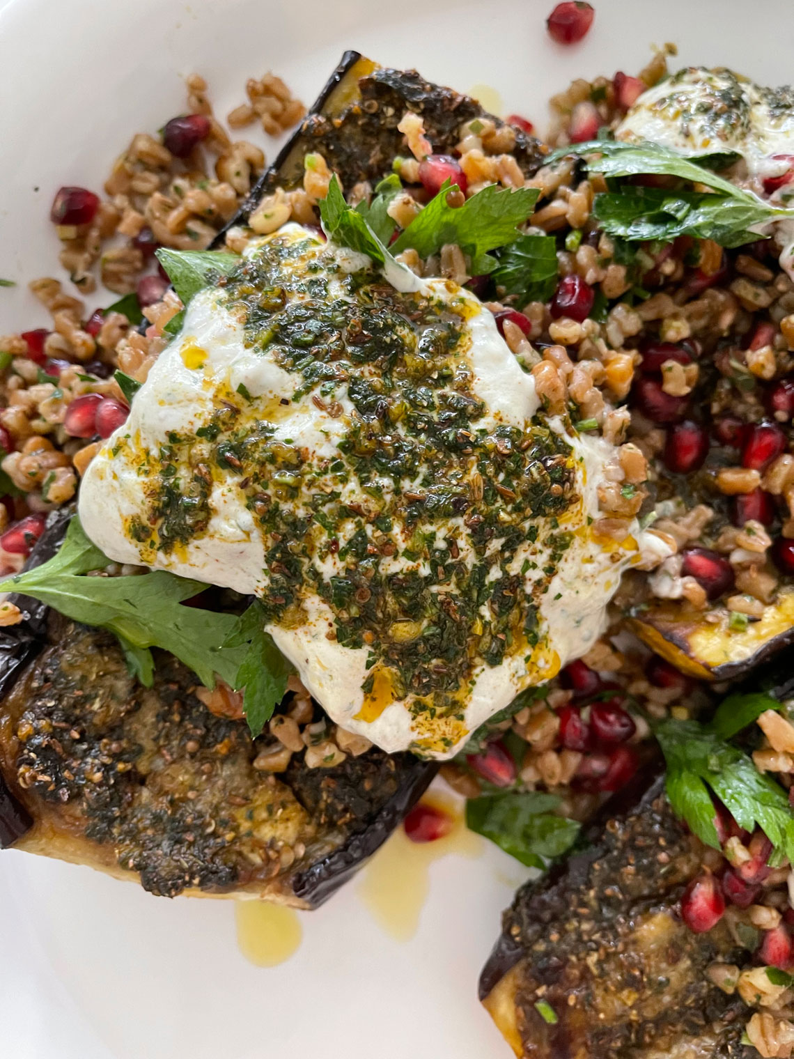 Chermoula is a delicious, herby North African sauce that I’ve adapted to the ingredients I had in my kitchen (lemon, parsley, garlic, cumin, and paprika, oh my!) that I slather on eggplant as it roasts, yielding a richly flavorful, creamy flesh that creates the ideal base for nutty farro (or brown rice!), a scattering of fresh herbs, and sweet-tart pomegranate seeds for a burst of sweetness. I dollop lemony yogurt overtop just to keep it all extra luscious.
